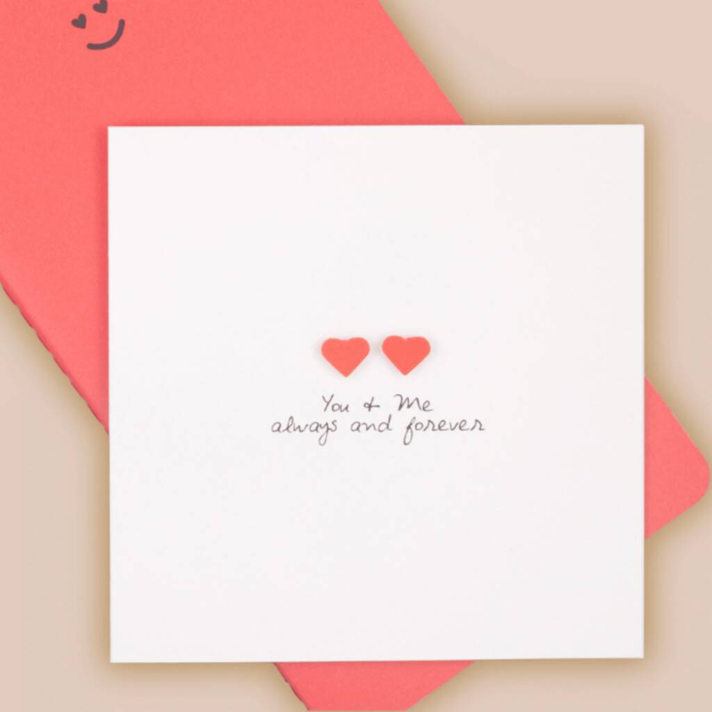 Presenting our artisanal LGBT card featuring the sentiment 'You & Me Always and Forever.' Adorned with two striking strawberry-red hearts above, this design radiates love and solidarity.