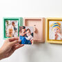 This set of three floating photo frames includes one of each colour – terracotta peach, yellow and turquoise green. Each frame displays your glossy metal photo as if it’s floating, held perfectly in place by a hidden magnet. The frames are hand-cast in jesmonite and can stand freely or be wall mounted. Add an optional hidden message on the back of each photo.