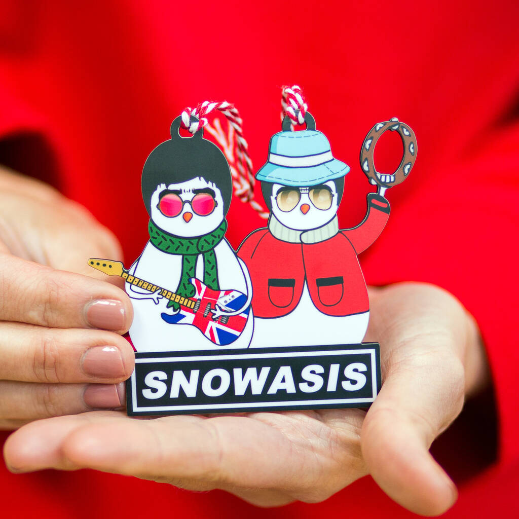 A fun bauble featuring Liam and Noel as snowmen, perfect for Oasis fans or music lovers looking for a unique Christmas tree decoration.