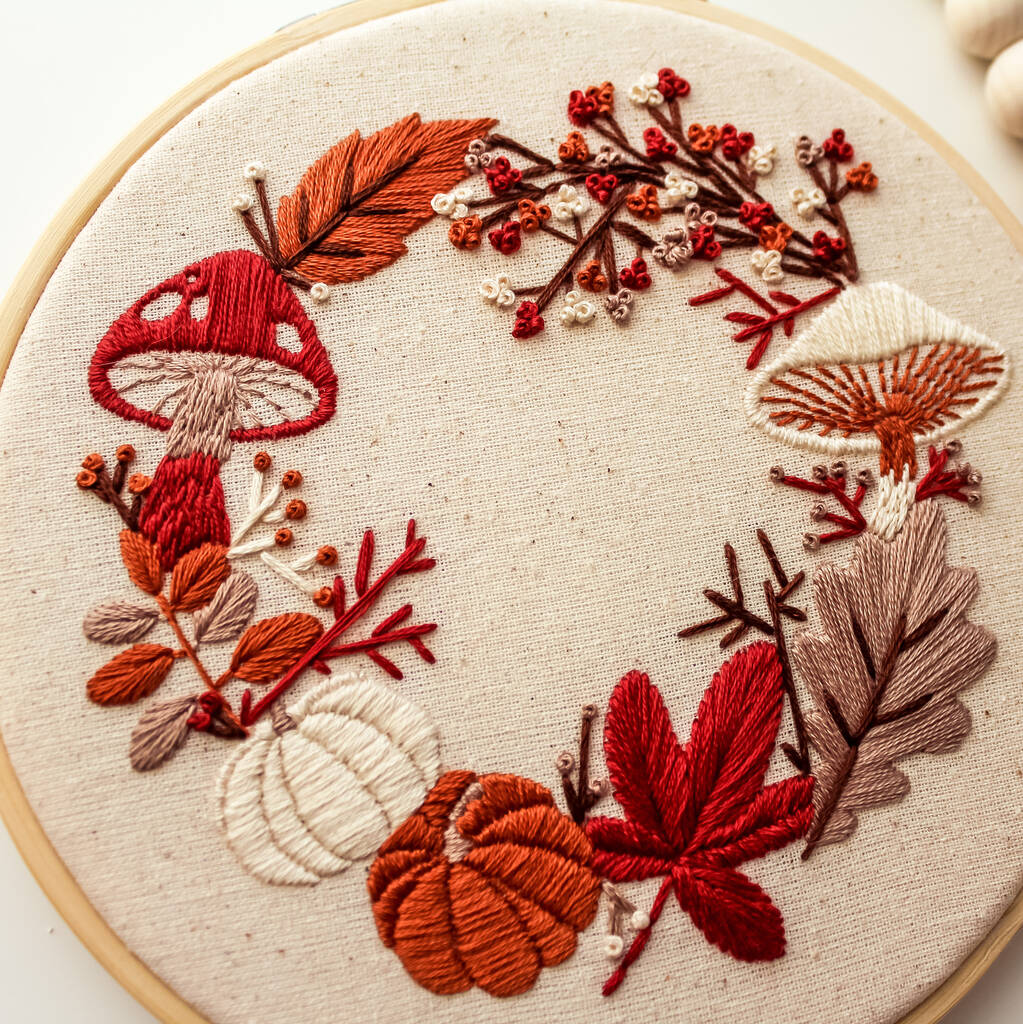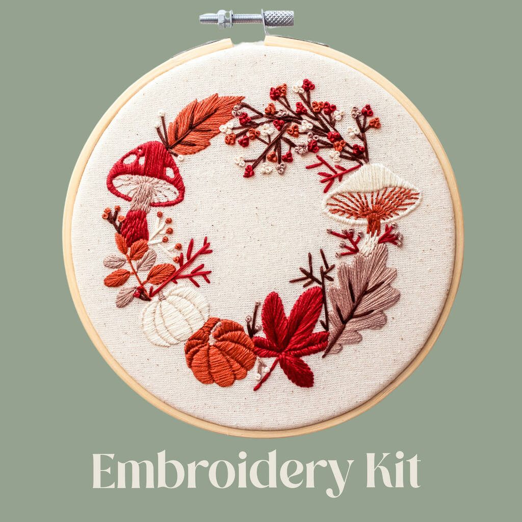 A cosy autumn wreath embroidery kit with pumpkins, mushrooms and autumn foliage. Ideal for beginners, with everything included and stitch tutorials provided online.