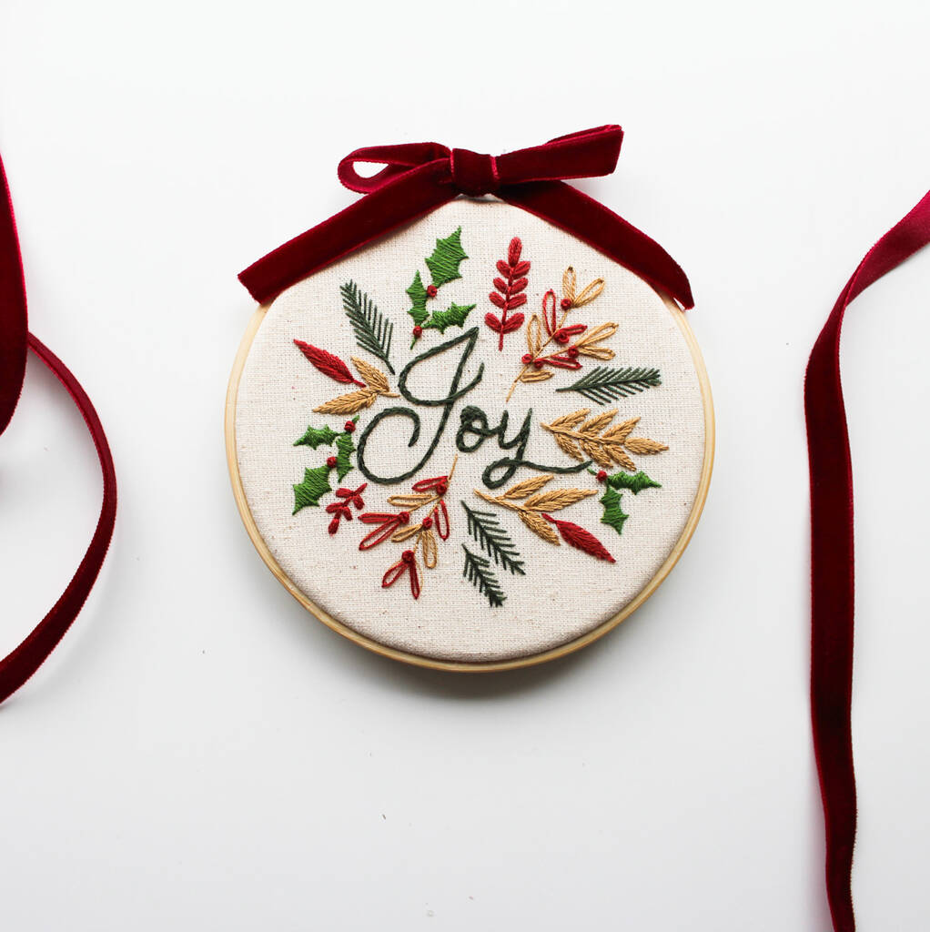 A joyful festive embroidery kit with the word “Joy” surrounded by scattered seasonal foliage. Beginner-friendly and includes everything you need to start stitching.