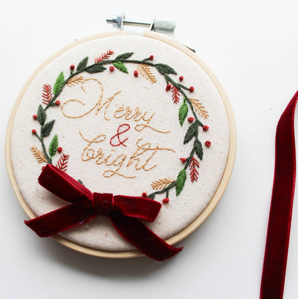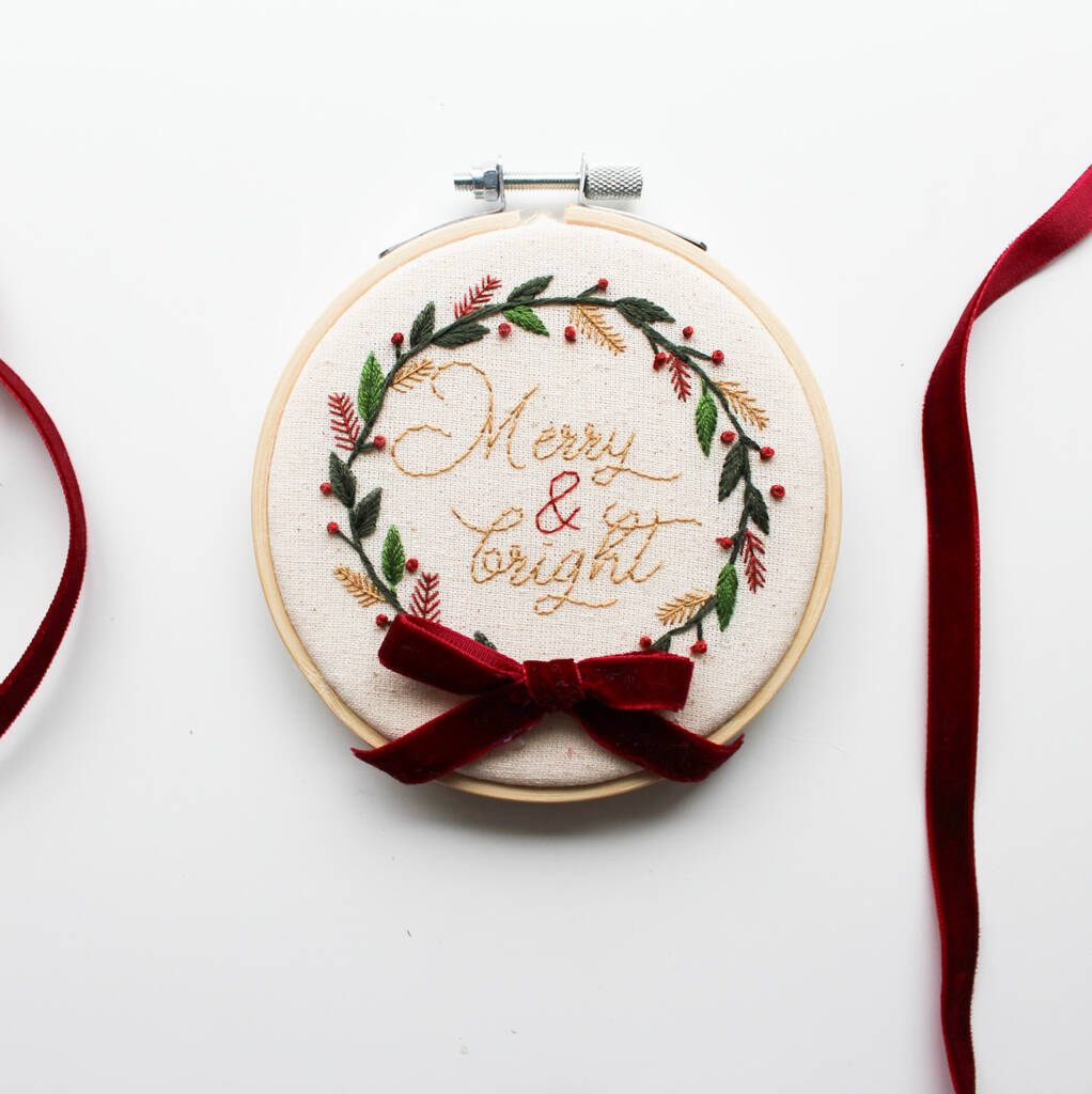 A festive embroidery kit featuring a foliage wreath and “Merry and Bright” lettering. Includes everything needed – with a velvet bow added into the design.
