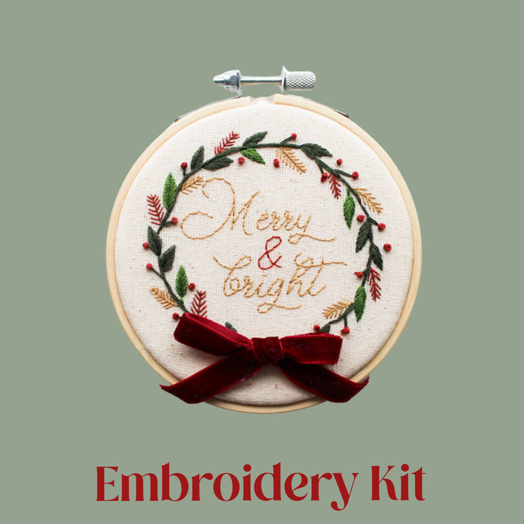 Celebrate the season with this joyful “Merry and Bright” Embroidery Kit, featuring a festive wreath of winter foliage and a stitched velvet-style bow as part of the design.