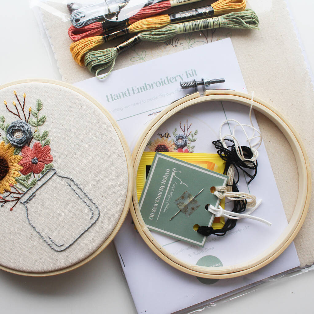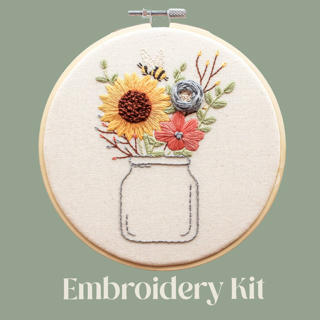 A vibrant embroidery kit featuring a vase of flowers, sunflowers, and a sweet bee. Beginner-friendly and perfect for a mindful, creative project – all included.