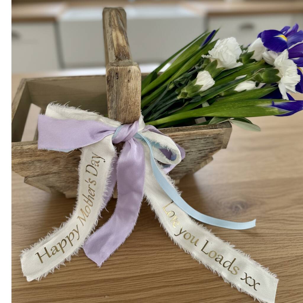 Hand torn silk ribbon will be fully personalised with your choice of wording on either end. For example as shown in the picture Happy Mother's Day Mum or one end and Love you lots xx on the other. Please just state personalisation in the personalisation box.
