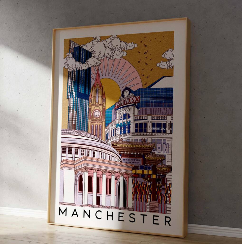 This stylish skyline print beautifully captures the essence of Manchester's iconic landmarks.