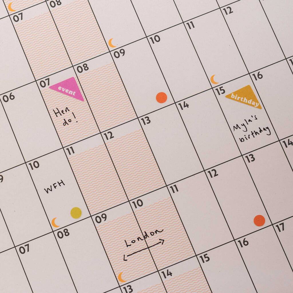 Moon phases and weekends are highlighted to help you balance the busy stuff with time to recharge.