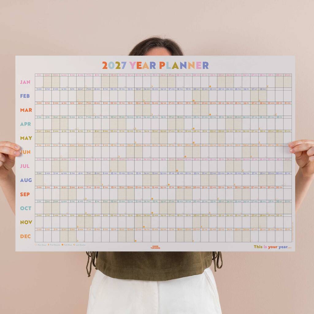 Our bestselling yearly wall planner returns for 2027 in fresh pastel colours, helping you see the year clearly while adding soft colour to your space.Our bestselling yearly wall planner returns for 2027 in fresh pastel colours, keeping your plans clear and bringing playful colour to your space. This large wall planner has a simple, modern layout that works easily in a home office, kitchen, or workspace. The 12-month overview makes it easy to track personal plans, family schedules, holidays, and work deadlines. Each day includes space for appointments, reminders, and key events. Week numbers and moon phases are included for extra clarity while planning. Sized to fit most spaces, including the back of a door, it offers a clear view of your year.