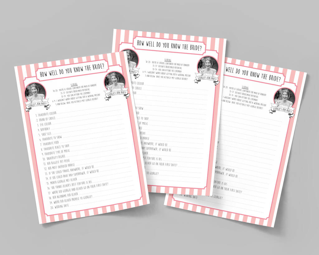 The quizzes are printed on A4 paper and can be personalised with a photo of the bride, her name and partner's name.