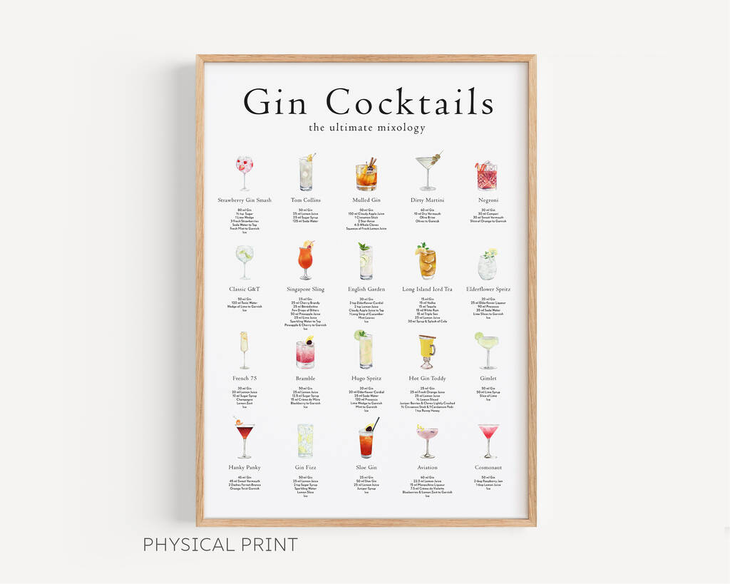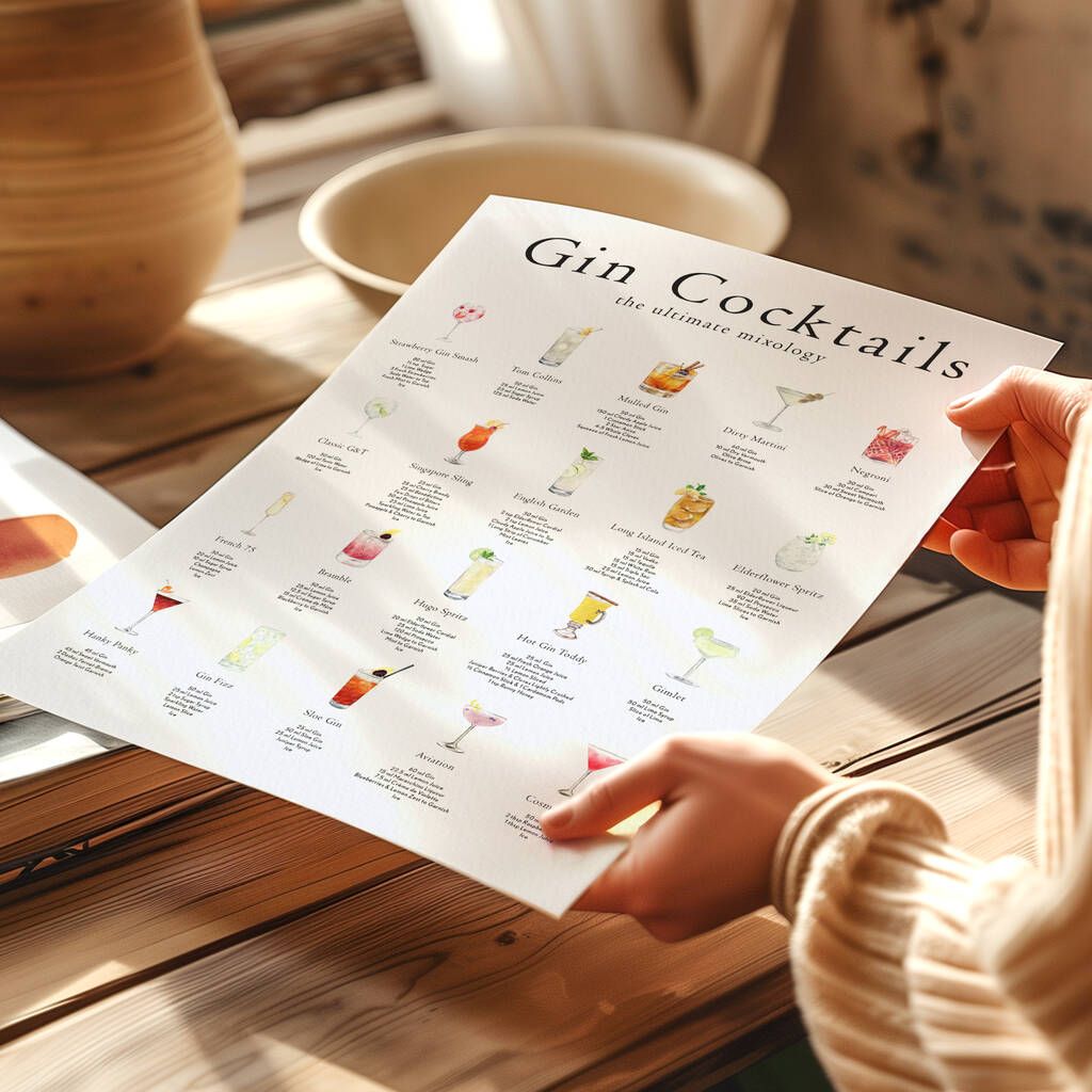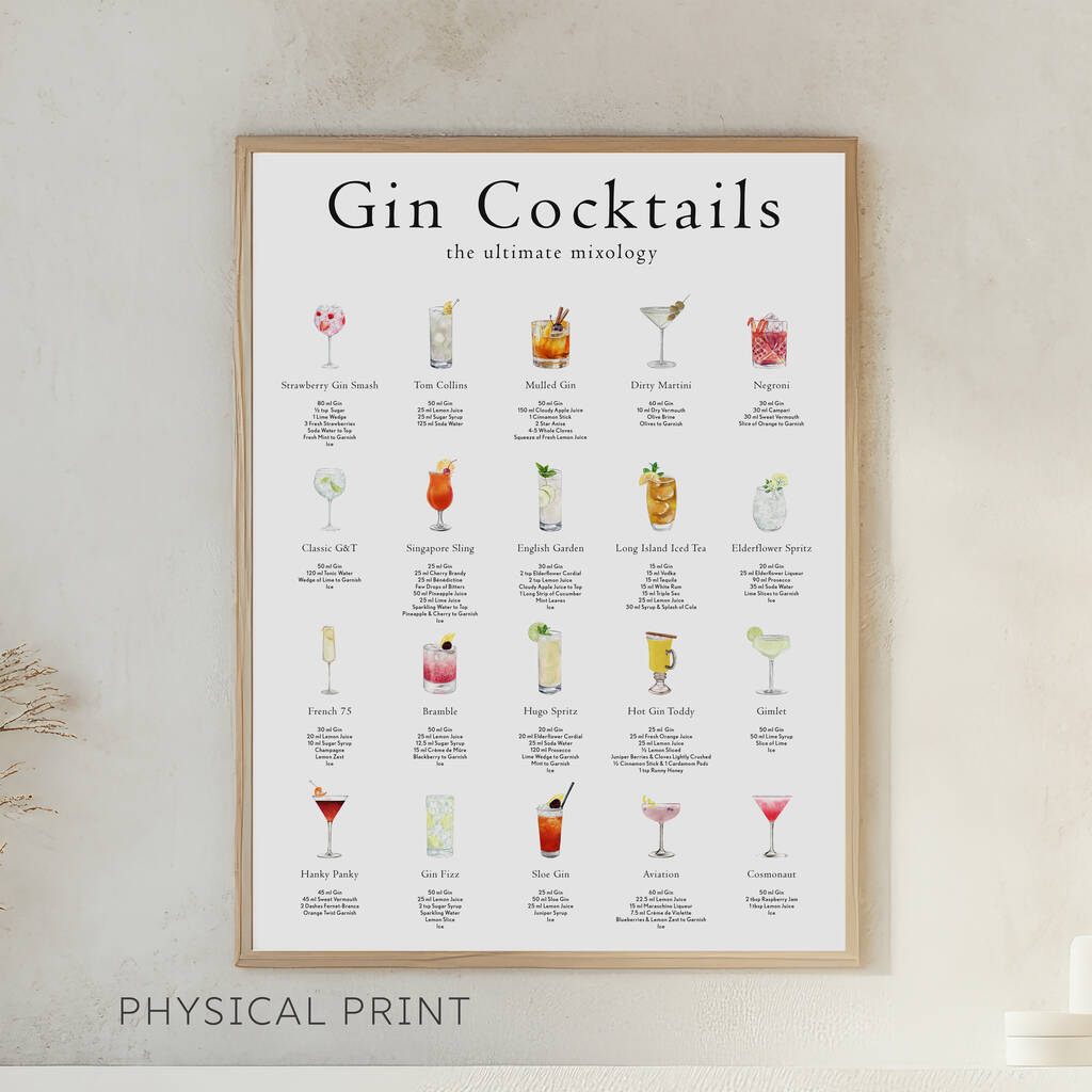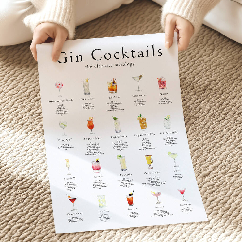 A Gin Cocktail poster, featuring favourite cocktails, perfect as a gift or for your own kitchen or bar wall.