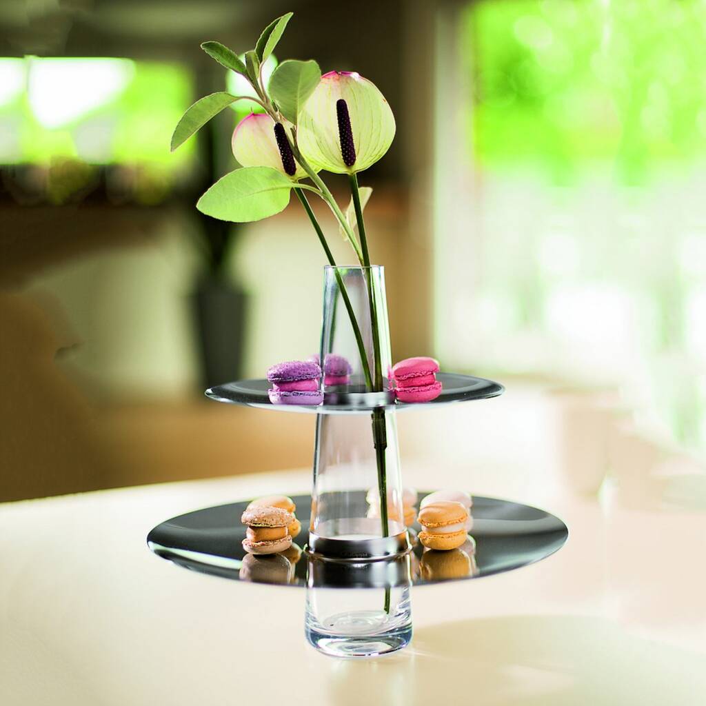This luxurious two-tier etagere combines gleaming plates, delicate filigree, elegant long-stemmed flowers, showcasing exquisite quality while presenting pralines and treats with timeless sophistication and allure.This exquisite two-tier etagere elevates any table with a perfect blend of luxury, quality, and refined design. Gleaming, reflective plates appear to make pralines, petit fours, and other treats float effortlessly, creating an irresistible display that delights the senses. Each tier is complemented by delicate filigree detailing and crowned with individually crafted long-stemmed flowers, adding an artistic and elegant touch. Designed for both beauty and functionality, it transforms serving into a sophisticated experience, capturing attention and admiration. Crafted with meticulous attention to detail, this etagere is a statement piece, combining timeless elegance with high-quality materials for an unforgettable presentation.