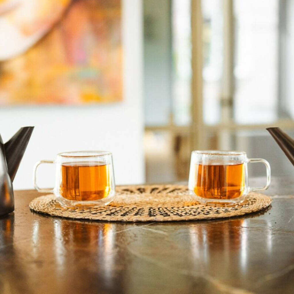 Enjoy tea in style with this two-piece set of 290ml double-walled borosilicate glasses, keeping drinks hot longer, microwave and dishwasher safe, perfect for desserts too.Elevate your tea time with this elegant set of two double-walled tea glasses, designed to keep your beverages warmer for longer while adding a touch of style to every sip. Each glass holds a generous 290ml and is crafted from durable, heat-resistant borosilicate glass, ensuring long-lasting everyday use. Microwave and dishwasher safe, these versatile glasses are perfect for enjoying tea, coffee, or even serving desserts. The clever double-wall design not only insulates your drinks but also creates a visually appealing floating effect. Practical, chic, thoughtfully designed, this set is an ideal addition to any kitchen experience. Matching Teapot Available.