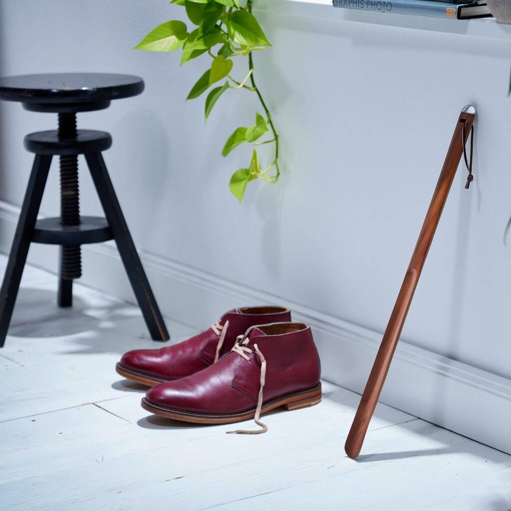 Our shoehorn blends luxury, quality, timeless elegance, crafted from walnut wood with stainless steel, offering effortless comfort, refined style, a durable accessory for any wardrobe.Our Shoe Horn is the perfect fusion of luxury, quality, and timeless design, crafted for those who appreciate both elegance and practicality. Made from high-quality, sustainable walnut wood, it features a long, ergonomically designed shaft that allows effortless shoe-wearing without bending, protecting your back while enhancing comfort. The polished stainless steel cap adds a refined, luxurious touch, while the small leather loop ensures stylish, convenient storage. Durable and built to last, it lifts a simple daily routine into a sophisticated experience. Whether as a thoughtful gift or a personal indulgence, it combines functionality, craftsmanship, and elegance in one indispensable accessory.