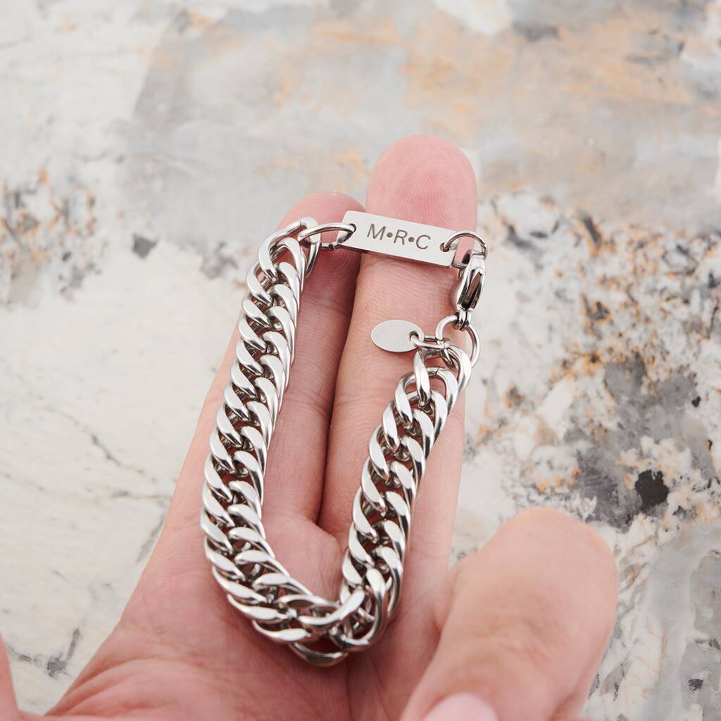 This bracelet is engraveable with up to 10 characters, allowing you to personalise it with names, initials, dates, or symbols — making it uniquely yours or the perfect meaningful gift. Pair it with the matching Flat Curb Chain for a complete, cohesive look.