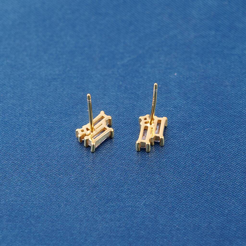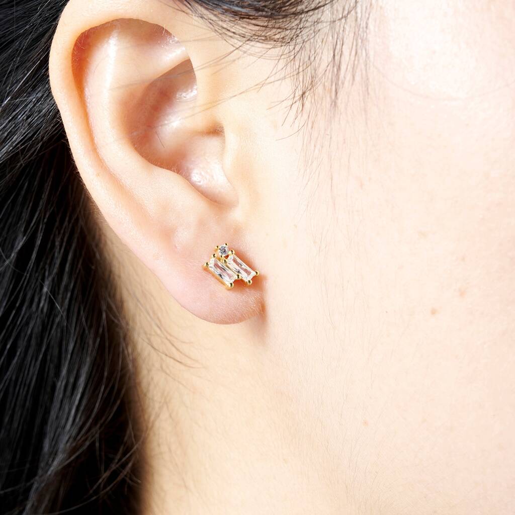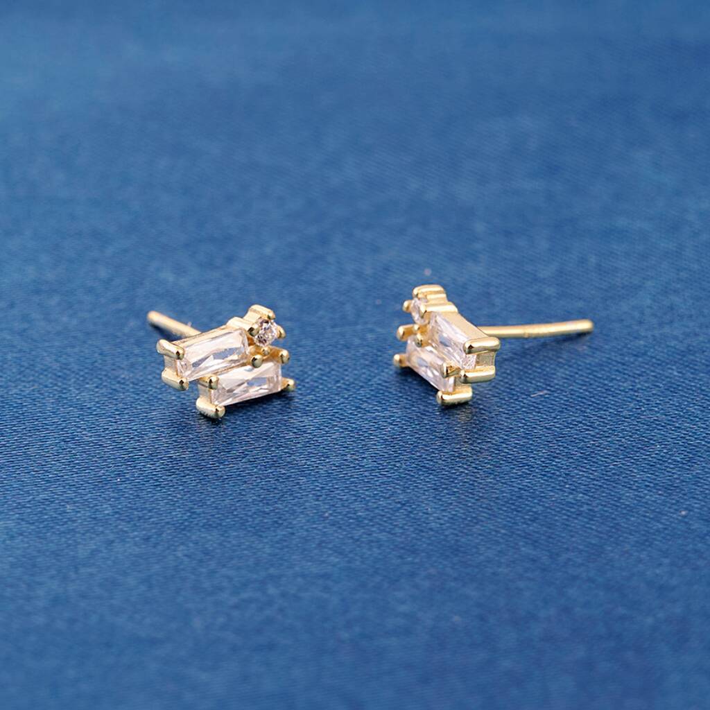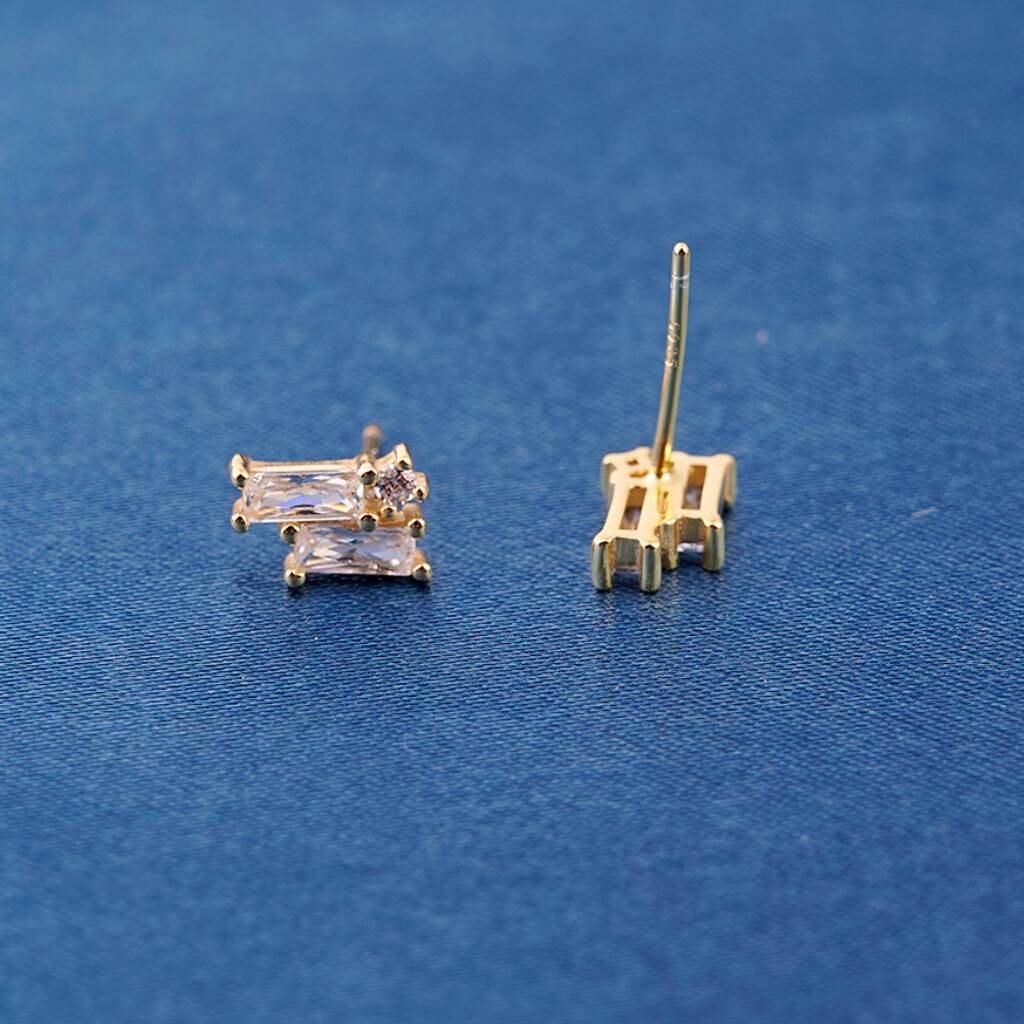 Elegant and timeless, these stud earrings are crafted in 925 sterling silver with a luxurious layer of 18k gold plating. The centrepiece features a baguette-cut cubic zirconia stone, accompanied by a smaller round-cut zirconia above it, creating a refined contrast of shapes and sparkle.