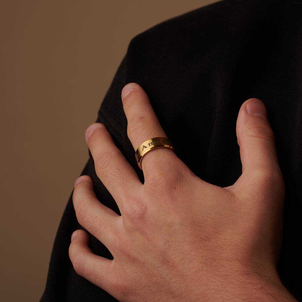 This band is crafted from 316L stainless steel, plated in 18k gold for a lasting, luxurious finish. Its smooth, rounded edge and polished surface create a sleek silhouette designed for everyday wear — a modern essential elevated by meaning.