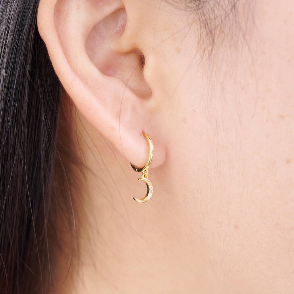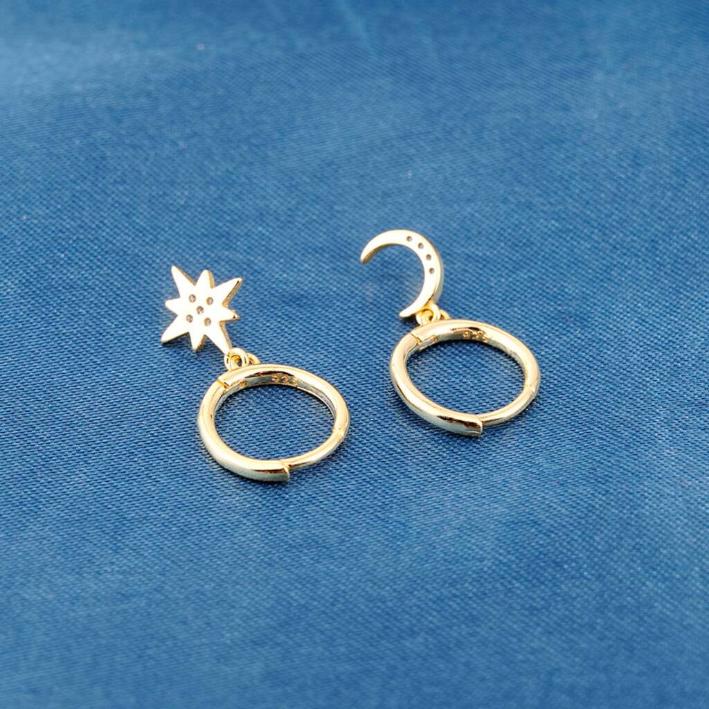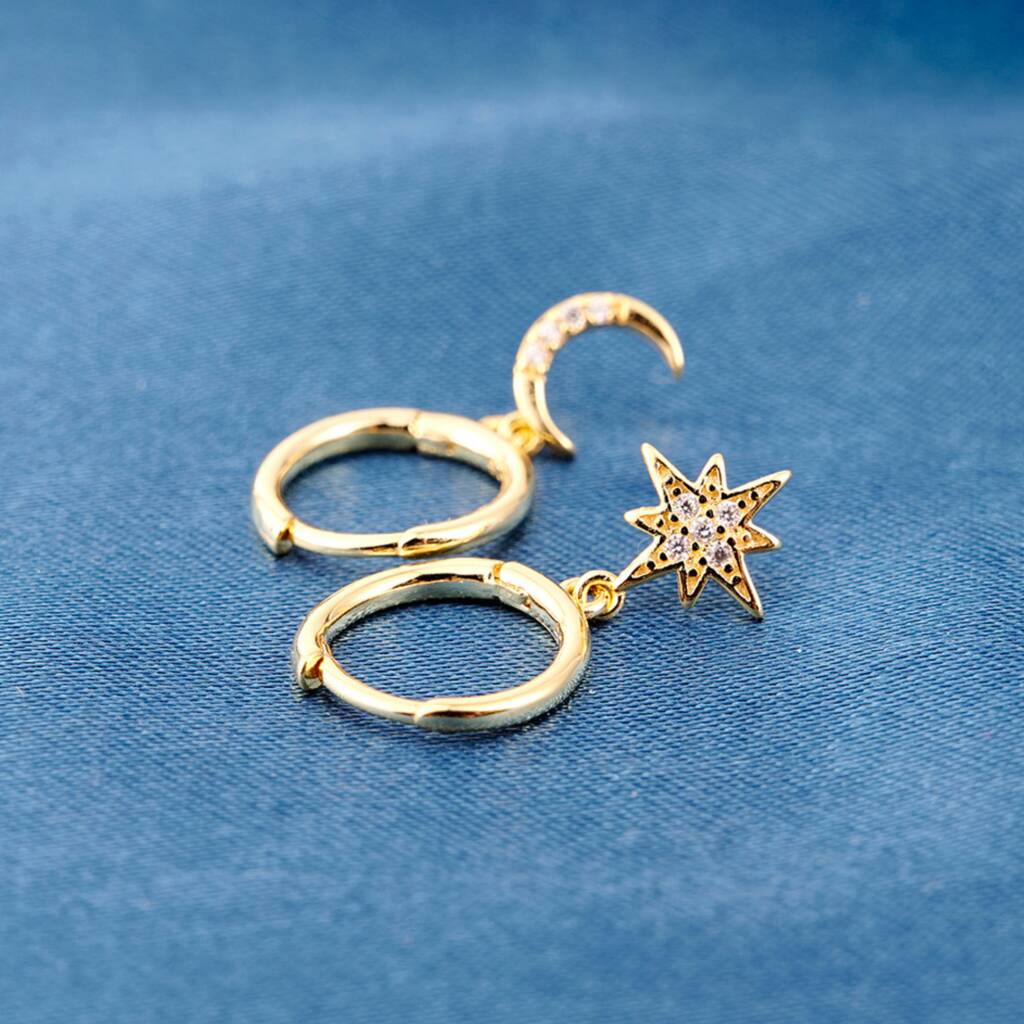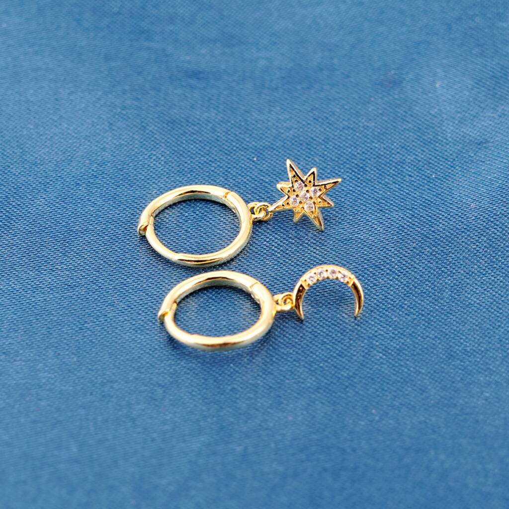 Bring celestial charm to your jewelry collection with these stunning 925 sterling silver plated with 18K Gold hoop earrings , featuring a stylish mismatched design. One hoop showcases a delicate crescent moon encrusted with sparkling cubic zirconia, while the other highlights a radiant eight-pointed star adorned with a central crystal for added brilliance.