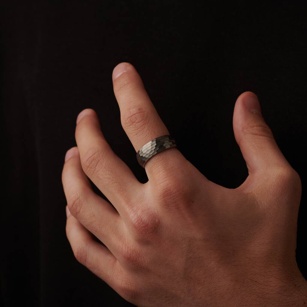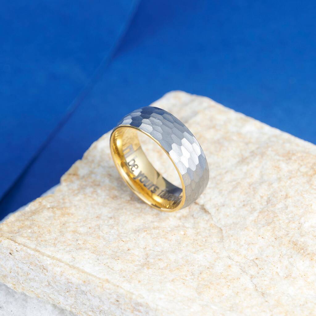 This ring is forged from premium tungsten carbide, one of the hardest metals on earth — chosen for its exceptional durability and weight of quality. The hammered silver finish adds refined texture, contrasted by a polished 18k gold interior that brings warmth and depth to its design.