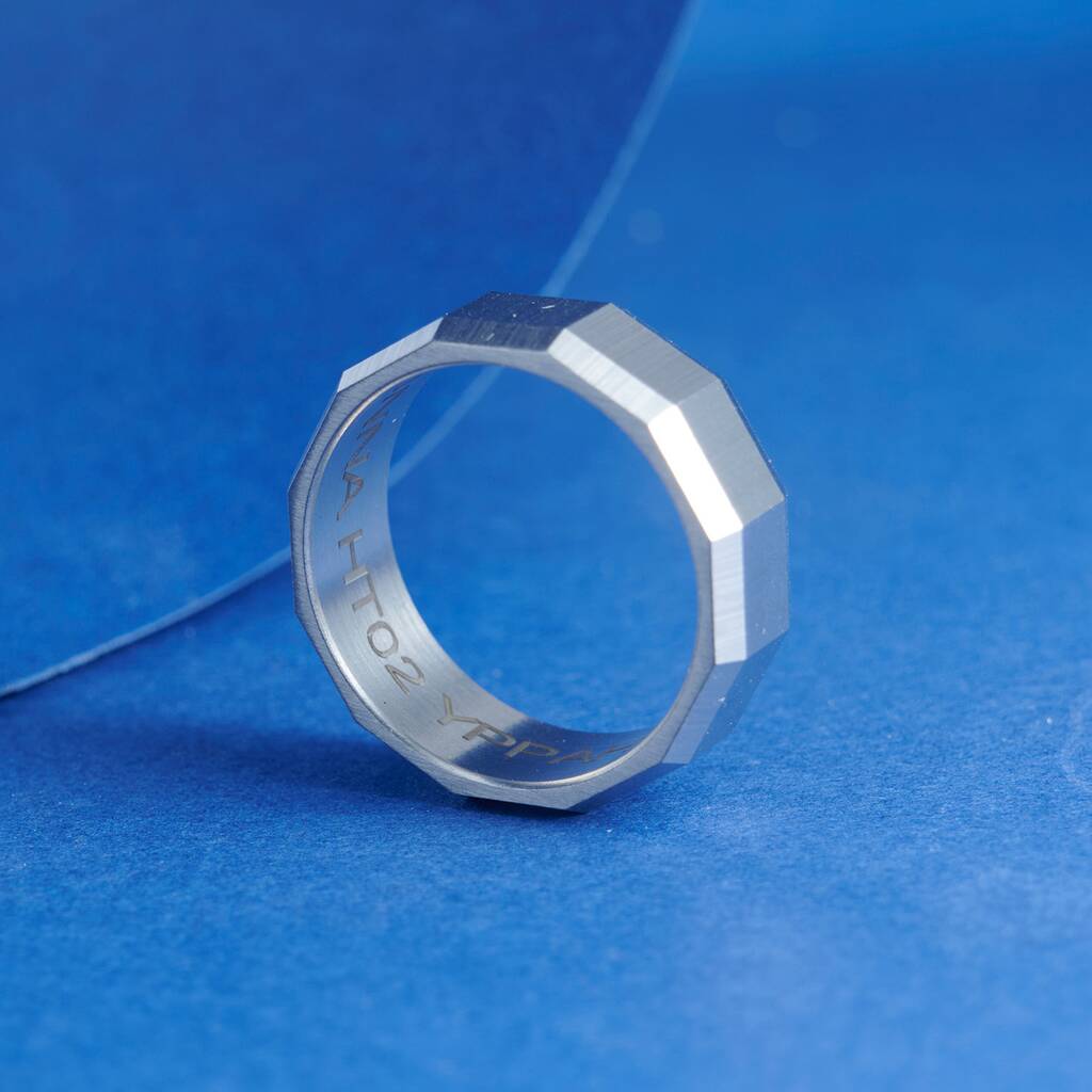 Material: 316L Stainless Steel Finish: Polished Silver Style: Faceted Band Width: 8mm Engraving Options: Up to 30 characters (inside or outside) Durability: Waterproof, Tarnish-Resistant, Hypoallergenic