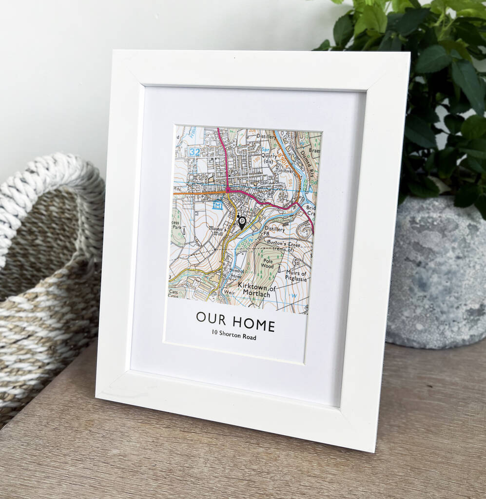 Celebrate a new home with this personalised UK map print, beautifully designed and professionally framed, ready to hang. A thoughtful and unique gift for new homeowners, this custom map pinpoints your chosen location – whether it’s a first home, a family house, or a memorable place in the UK.