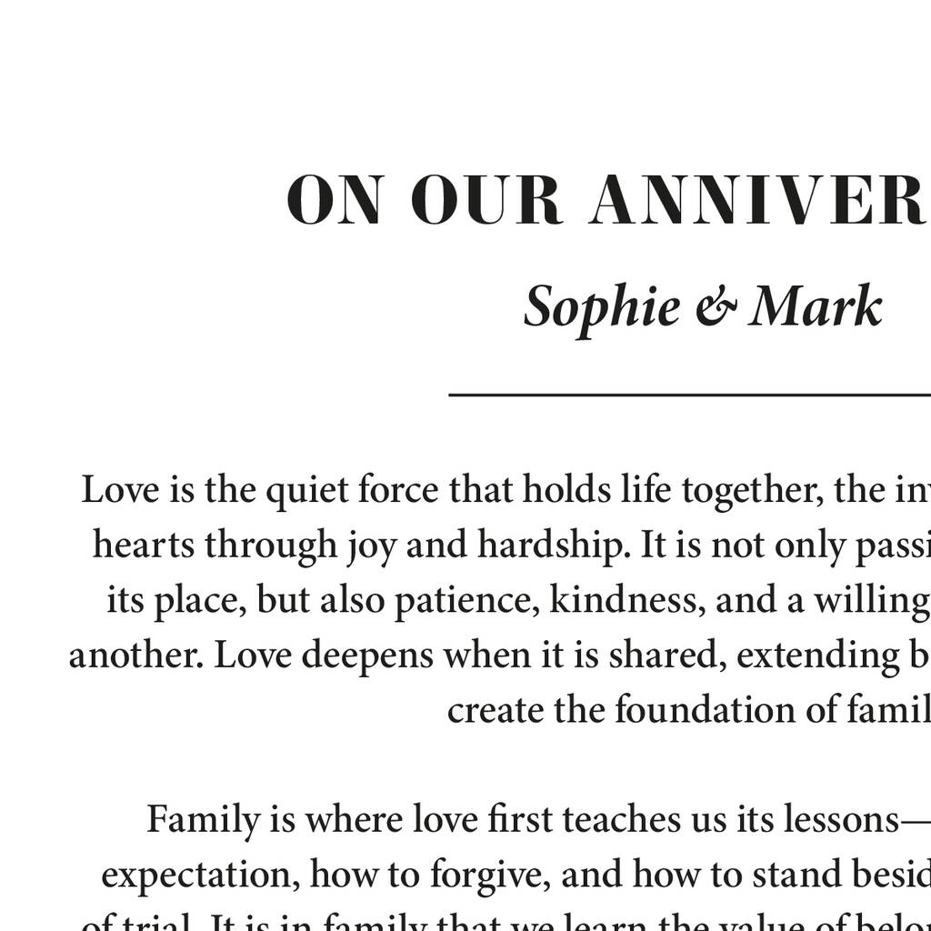 Whether it’s your wedding vows, a heartfelt love letter, a favourite poem, or the lyrics from your first dance, this simple yet stylish design transforms your words into a timeless keepsake.