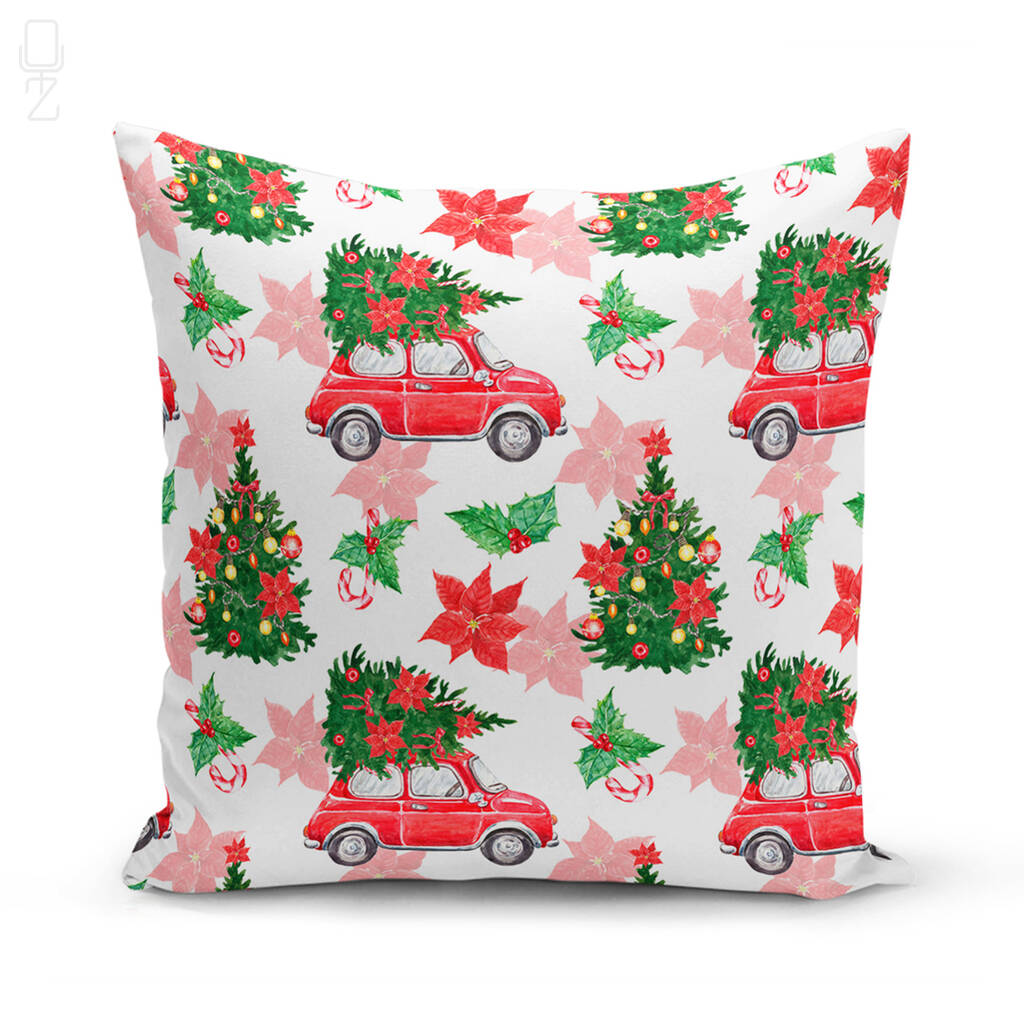 Nostalgic Red Car With Pine Tree Christmas Chenille Cushion