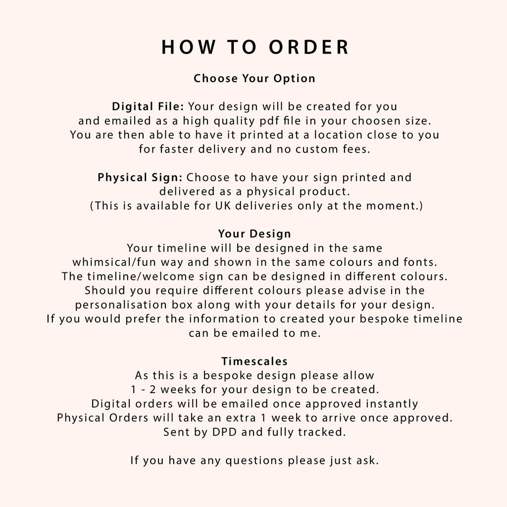 Your timeline will be designed in the same whimsical/fun way and shown in the same colours and fonts. The timeline/welcome sign can be designing in different colours. Should you require different colours please advise along with your details for your design which can be emailed to me directly once ordered.