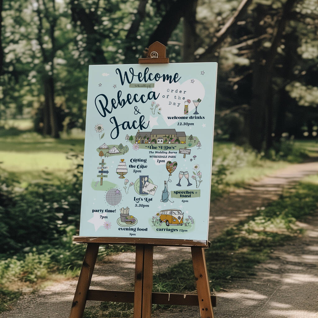 Beautiful bespoke hand illustrated wedding welcome board with timeline of events. Timeline of events are hand illustrated and created in your colour choices.