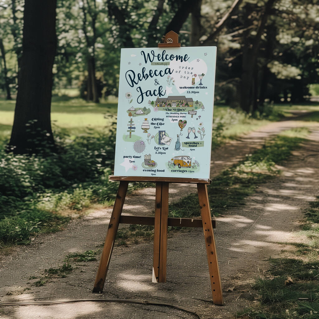 Bespoke to your wedding, will be created from scratch to reflect your wedding details.Will include an illustration of your wedding venue along with the timeline illustrations or anything you would specifically like to be illustrated.