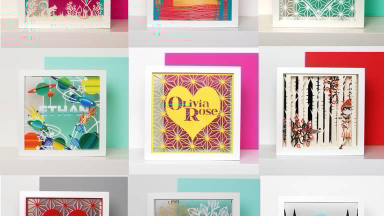 Working away in our little tree-top home studio in Surrey we dream up, design and then, the best bit...MAKE unusual and unique papercuts. Our collections include whimiscal fairytale woodlands, gorgeous geometrics and luxe London landmarks. We absolutely LOVE colour and offer a range of 35 beautiful bolds and pretty pastels for you to choose from. Each design is created using quality 225gsm card which, once cut, it is layered and encased in chunky box frames giving the finished product an intriguing 3D effect.
