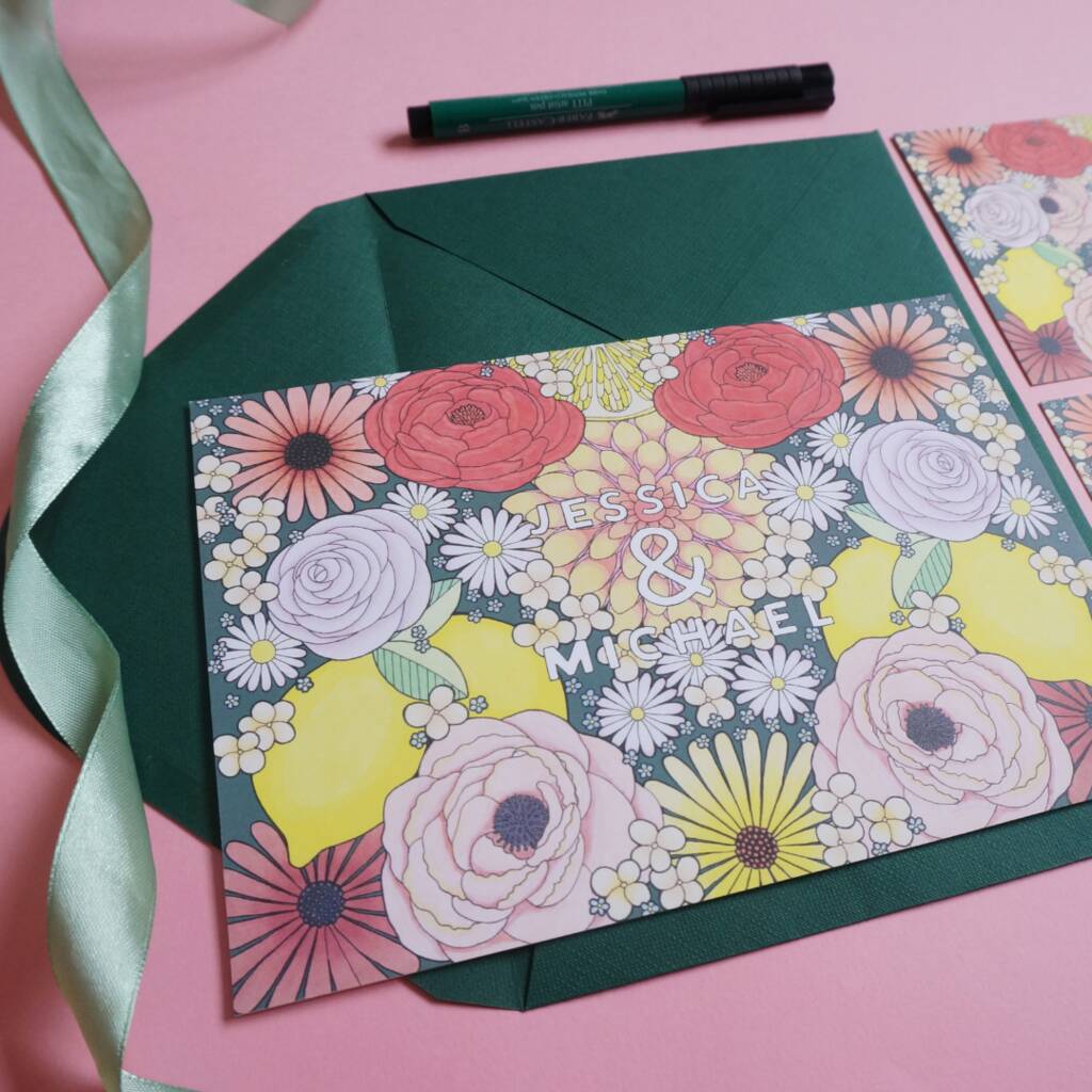 These special wedding invitations are completely customised for your wedding. An original drawing of your wedding flowers will start the process, and that will then be turned into your unique wedding invitations. Your guests will be delighted to find something so unique dropping through their letterbox to invite them to your special day!