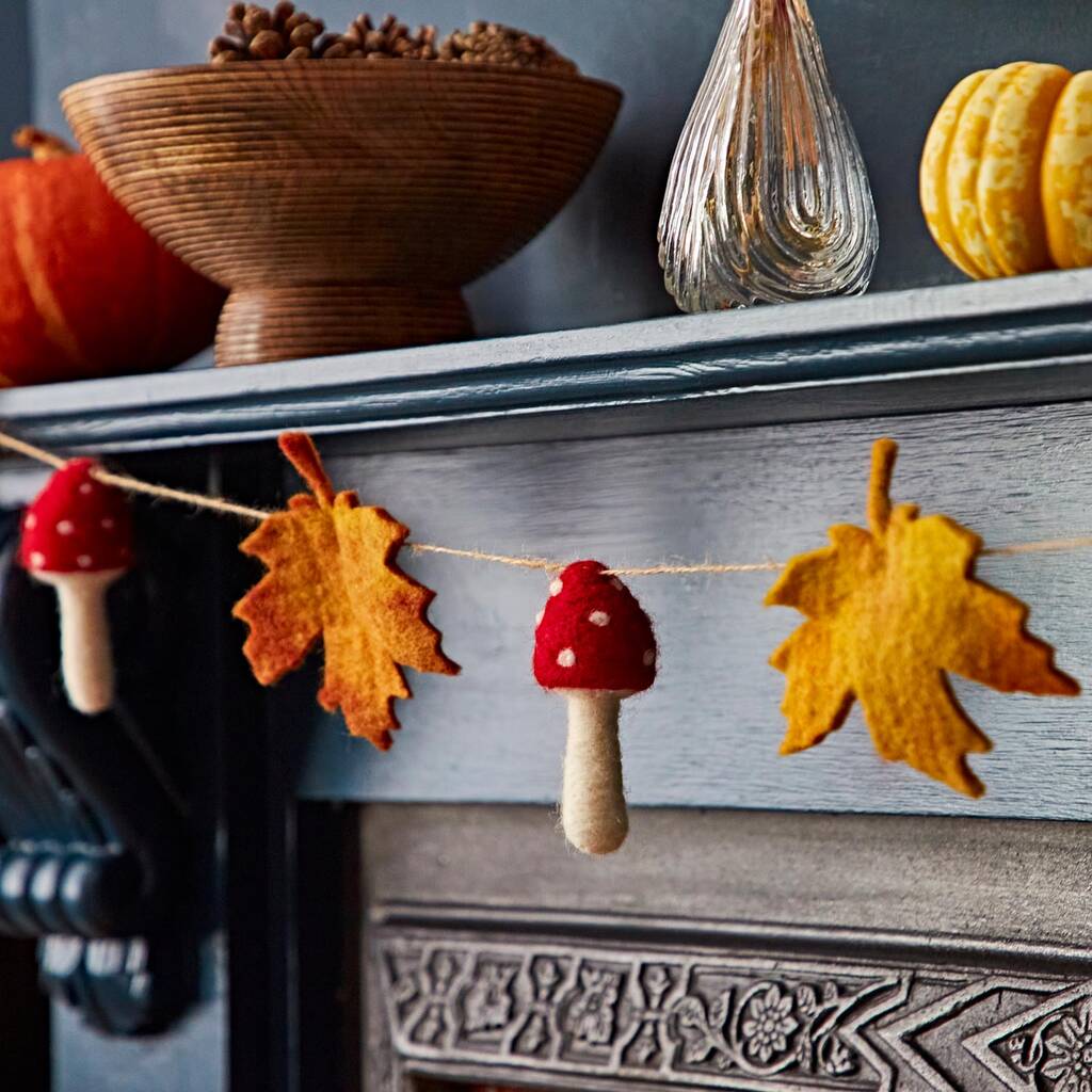 Our cute felt autumn leaf and mushroom garland features a handy loop on each end for easy hanging, and sustainable jute string.