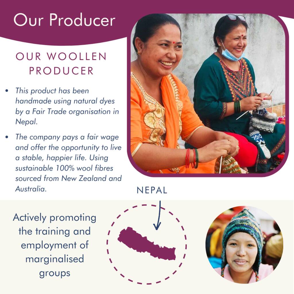 All of our woollen hats, handwarmers and socks are handmade by a Fair Trade organisation in Nepal.