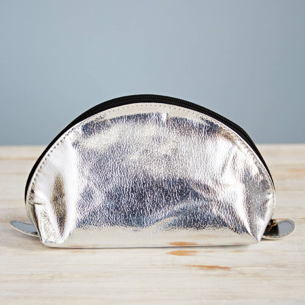The eye-catching metallic pouch is crafted from faux leather, with a zip closure. The interior of the pouch is fully lined in a black waterproof fabric.