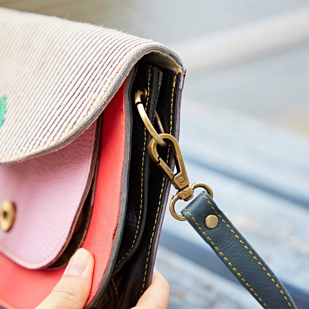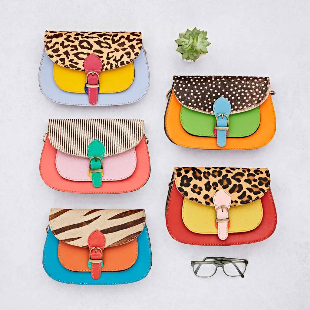 Our multicoloured rectangular saddle bag pairs bold design with everyday practicality. The structured body keeps your belongings protected, while the secure flap closure opens to three compartments and two zipped pockets – perfect for organising your phone, wallet, makeup and small essentials.