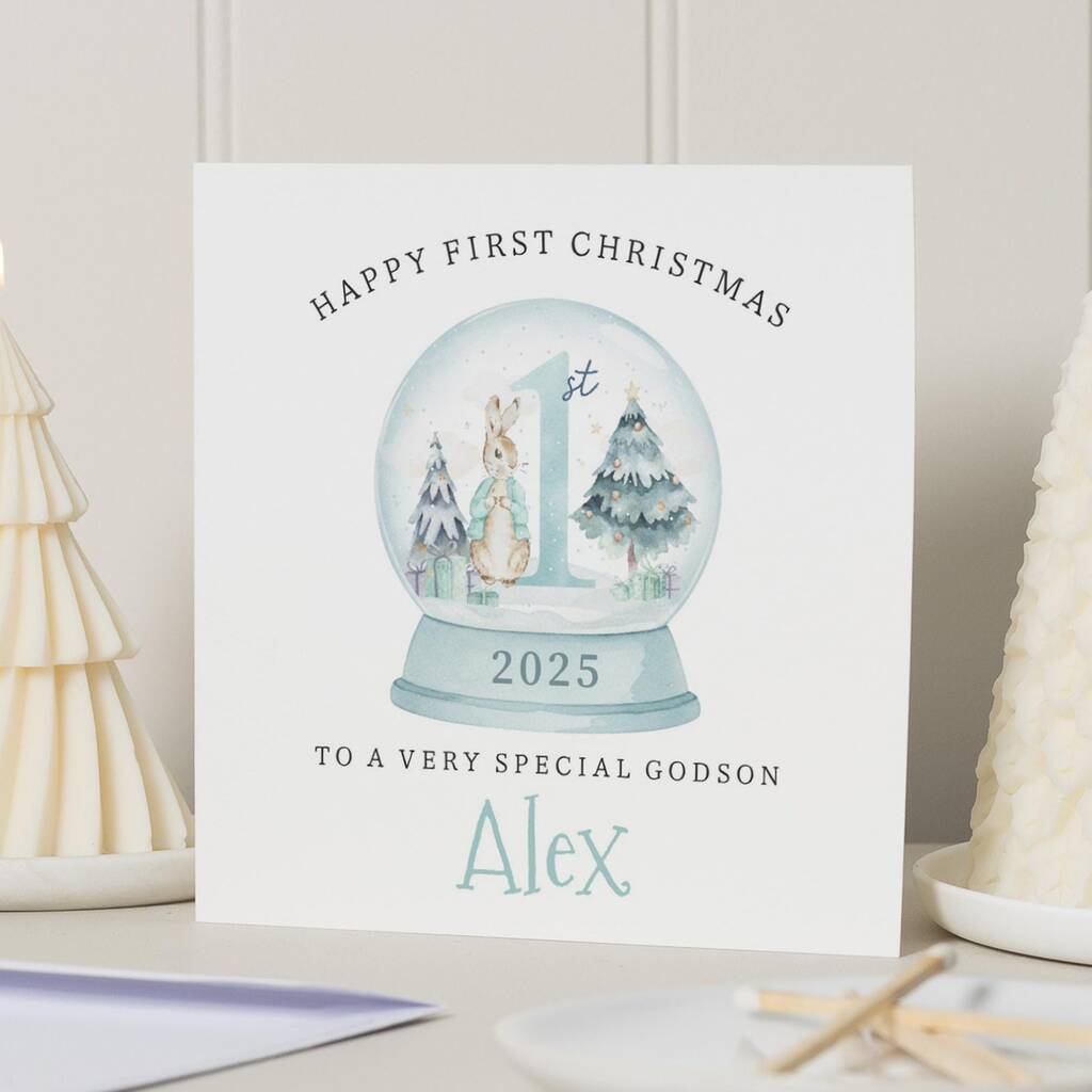 Personalised Godson First Christmas Snow Globe Card
