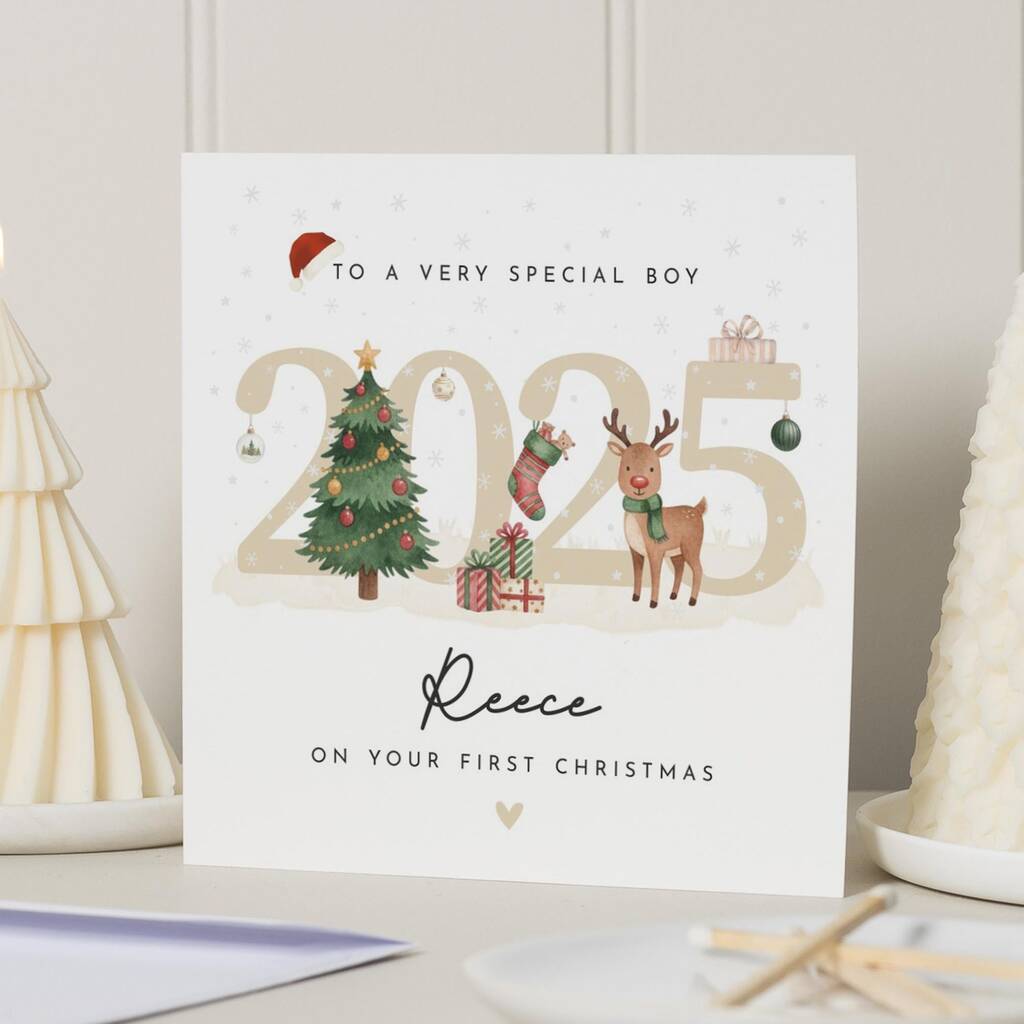 Personalised Reindeer First Christmas Card For Boy 2025