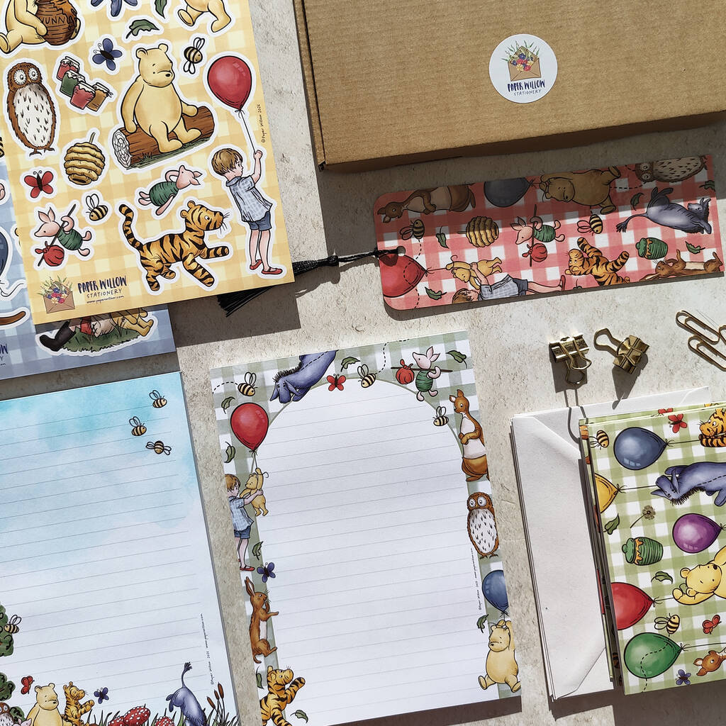 Winnie stationery gift set with 2 printed notepads, 2 sheets of A5 stickers, a double sided bookmark and 4 folded notecards and envelopes.
