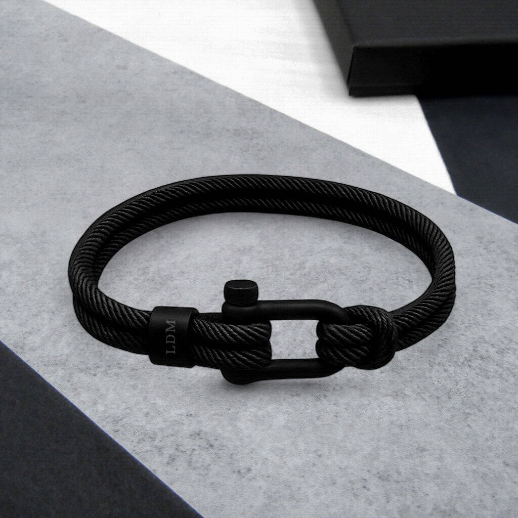 Bring a refined touch of nautical style to his everyday look with this personalised men’s double strand black rope bracelet, finished with a D-shackle clasp