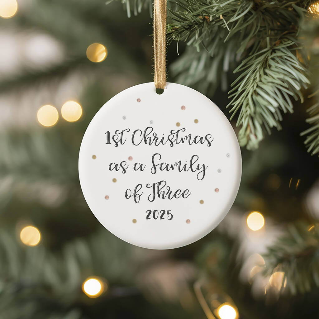 The decoration features the words 'first Christmas as a Family of [number] 2025'
