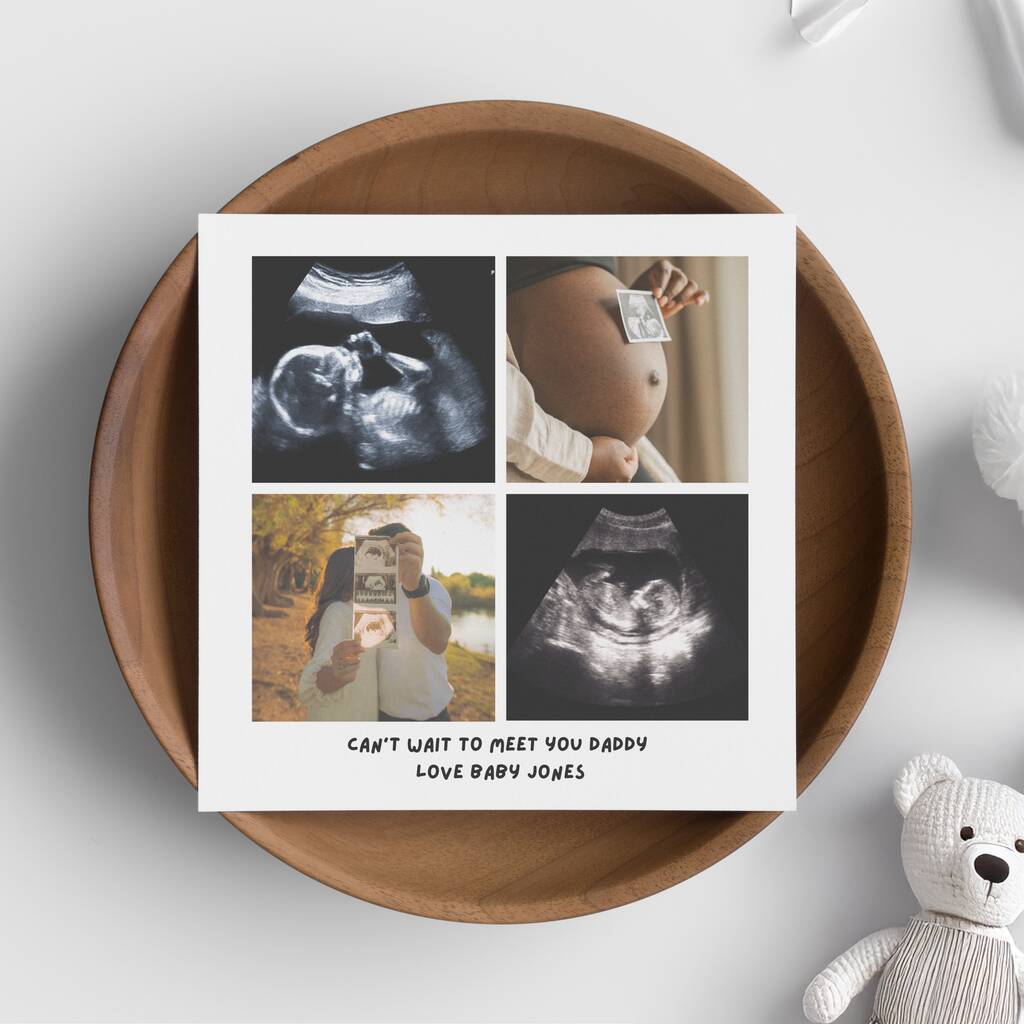 Featuring four of your chosen photos — ultrasound scans, bump shots, or favourite memories — each image is beautifully arranged and printed directly onto smooth matt card. The soft, non-glossy finish gives your images a warm, natural look, and the slightly softened edges add a handmade, heartfelt feel that makes every card unique.