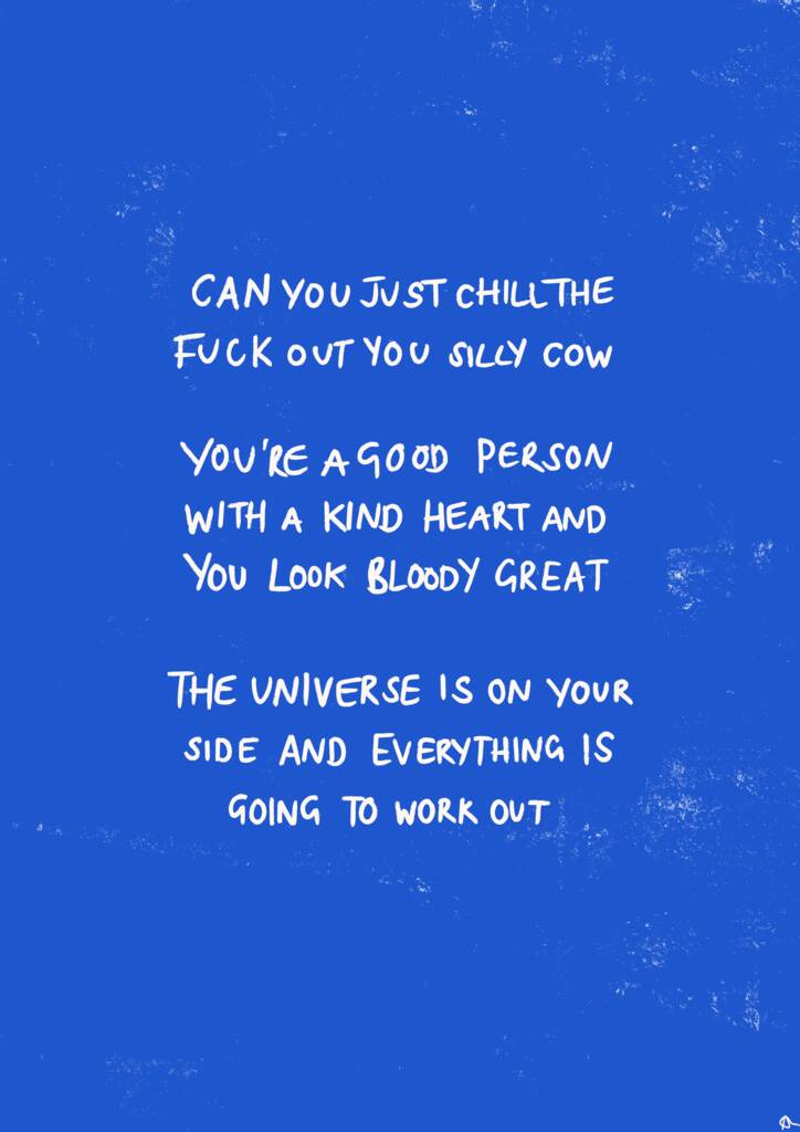 "Can you just chill the f*ck out you silly cowYou're a good person with a kind heart and you look bloody greatThe universe is on your side and everything is going to work out."