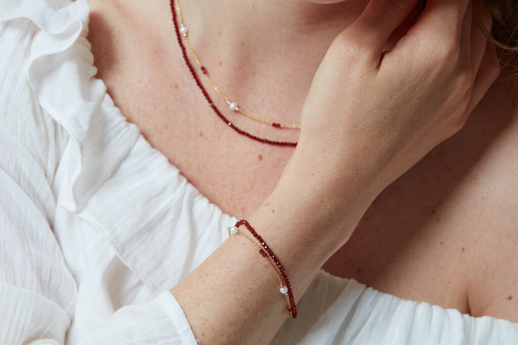 Cultured freshwater pearls and faceted red spinel on a non-tarnish gold plated copper chain. Pearls are quite soft and need special care after you wear them. Always store them in a separate jewellery pouch away from other jewellery and it is best to keep them in something soft. From time to time, after you wear your pearls you should wipe them with a soft damp cloth to prevent dirt, chemicals and perspiration from diminishing the lustre of the pearls. Always remember to take off your pearls when applying cosmetics, hairspray and perfume or when showering, swimming or sun-bathing. We recommend last on, first off!