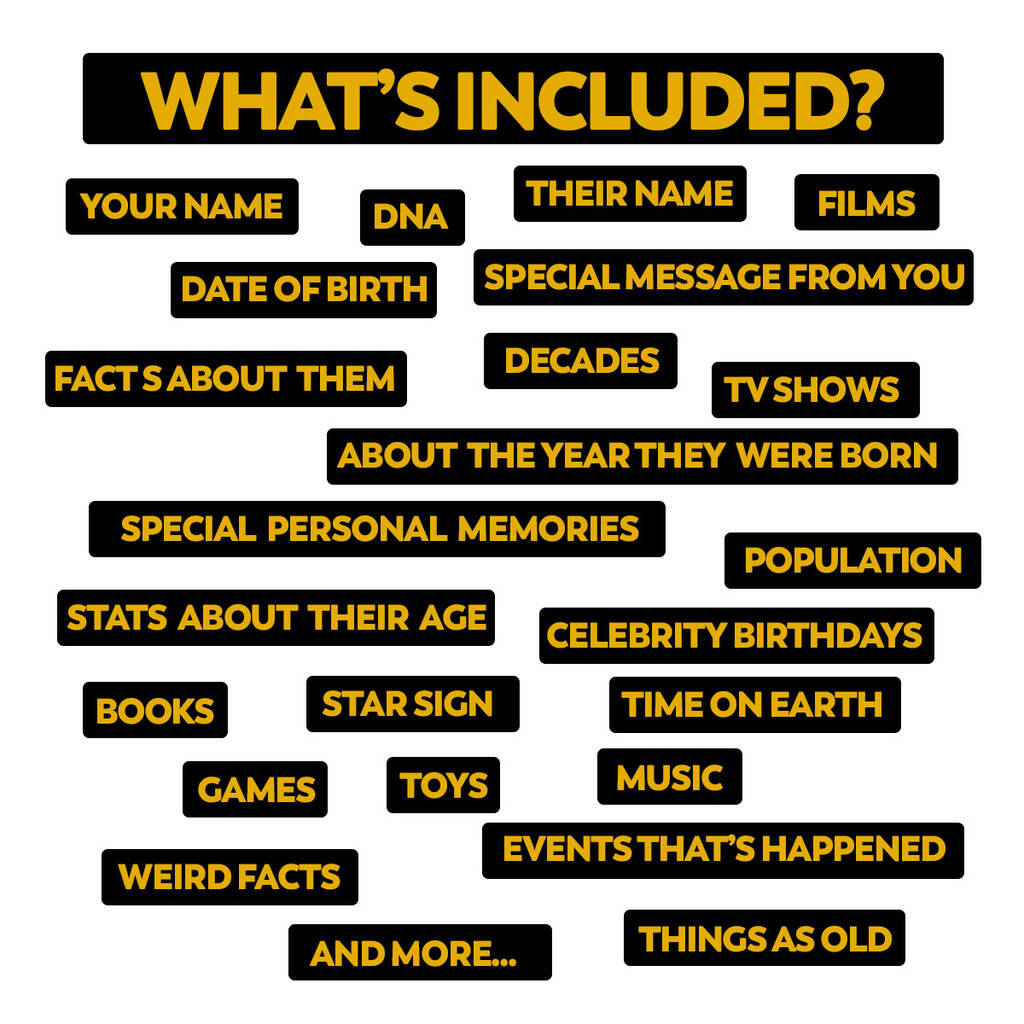 The book includes some defining facts about each year from their birth leading up to the current year, as well as facts about the year they were born. It also includes the top music, films, TV, and books of the year, their star sign and the famous celebrities that share the same day, memories about the decades they grew up in, and fun statistics about their age and their body.