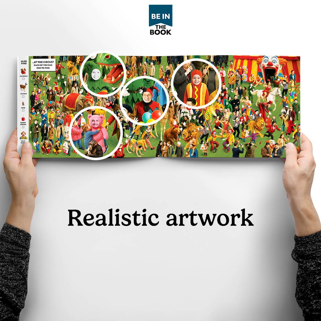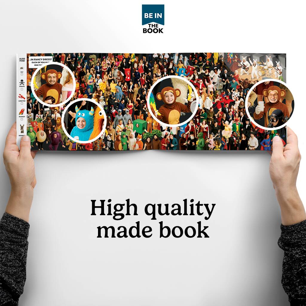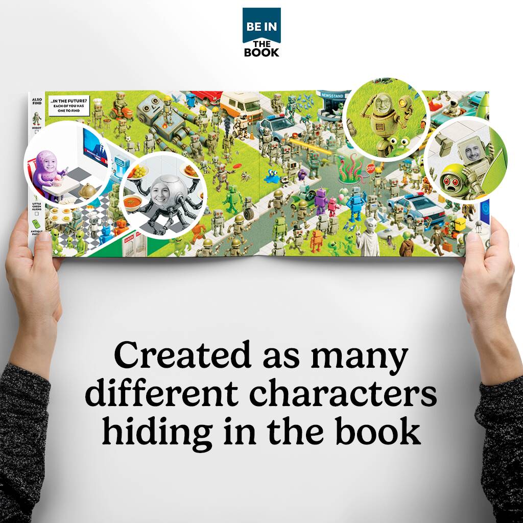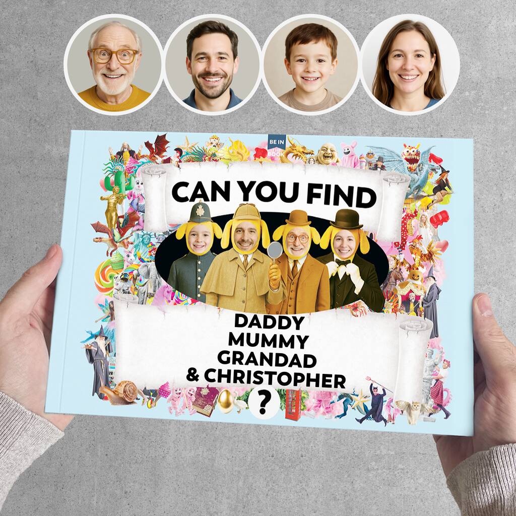 Find four members of the family in their own search and find book made from their photos, their images will be made into characters for them to find in the book. These can be Mum, Dad and two children, four friends, or four children as a gift for dad, or any other four people you would like included