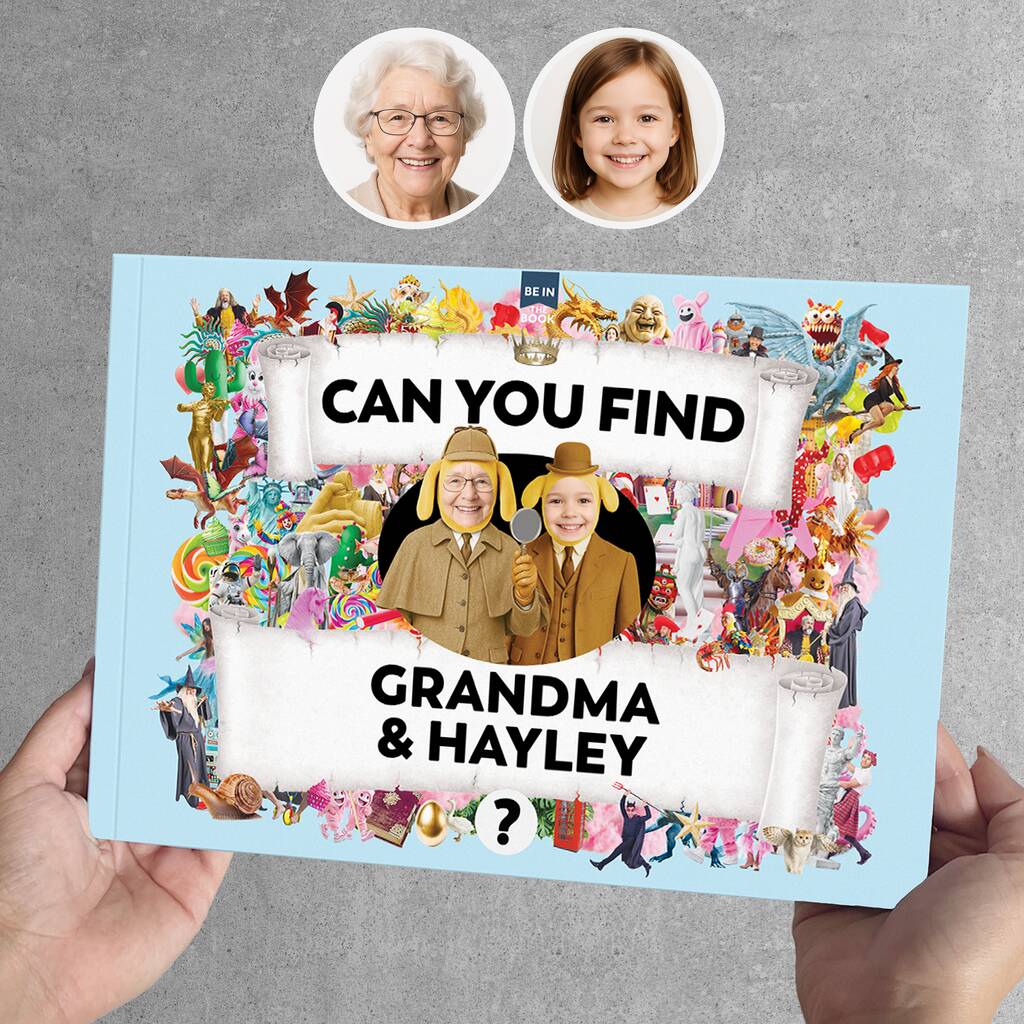 Upload photos of Grandma and her grandson or granddaughter, and they will be hidden in photorealistic scenes as various characters to find in multiple places within the book. This beautifully and vibrantly designed, large A4, high-quality book makes the perfect unique gift for new Grandma's on Mother's Day, birthday, Christmas, or special 'Grandmother' occasions.