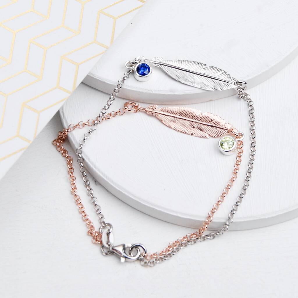 Personalised Feather Birthstone Bracelet In Silver And Rose Gold