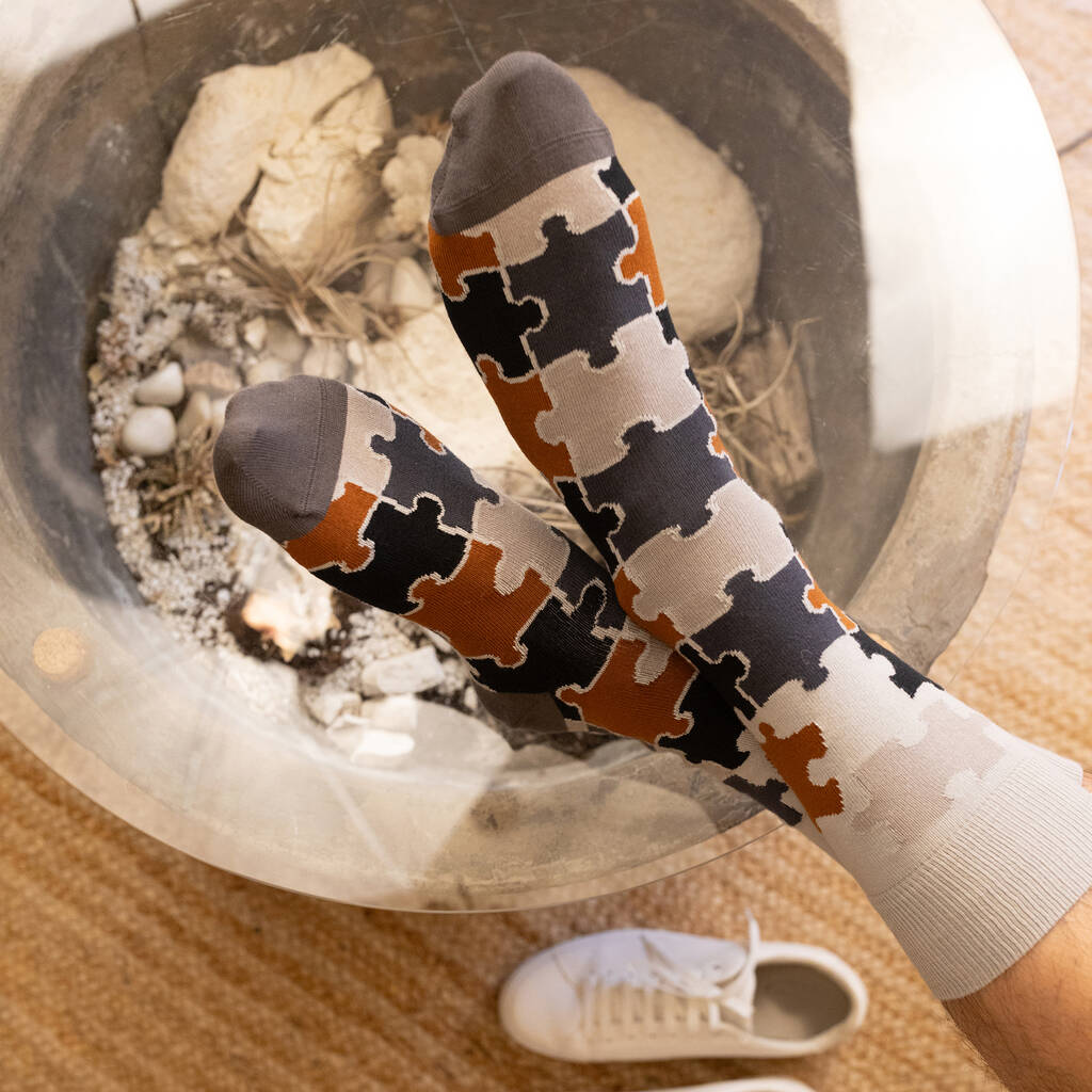 Two pairs of luxury socks: beige Peace and grey Jigsaw. Crafted in England from Supima cotton. Sustainable elegance with a modern twist.Enhance your sock collection with this distinctive bundle featuring two pairs: the beige Peace, showcasing colourful peace symbols, and the grey Jigsaw, offering a sophisticated puzzle pattern. Both pairs are crafted in England from high-quality materials — the Peace from soft Supima cotton for a luxurious feel, and the Jigsaw from eco-friendly recycled fibres, combining comfort with sustainability. Designed with a seamless toe for added comfort, these socks embody British craftsmanship and style. Perfect for those who appreciate both fashion and sustainability.