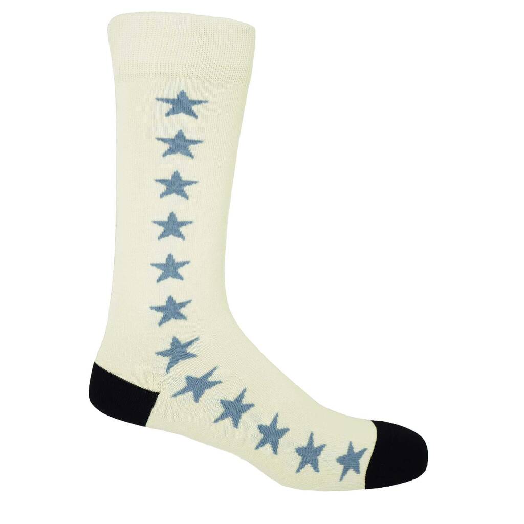 Light blue Recycled Ribbed and white Starfall. Crafted in England from recycled and Supima cotton. Sustainable elegance with a celestial touch.Enhance your sock collection with this distinctive bundle featuring two pairs: the light blue Recycled Ribbed, showcasing a classic textured finish, and the white Starfall, adorned with celestial-inspired star motifs. The Recycled Ribbed socks are crafted from high-quality recycled cotton and polyester, combining comfort with sustainability. The Starfall socks are made from Supima cotton, renowned for its softness and durability. Designed with a seamless toe for added comfort, these socks embody British craftsmanship and style. Perfect for those who appreciate both fashion and sustainability, these socks add a touch of personality to any outfit.