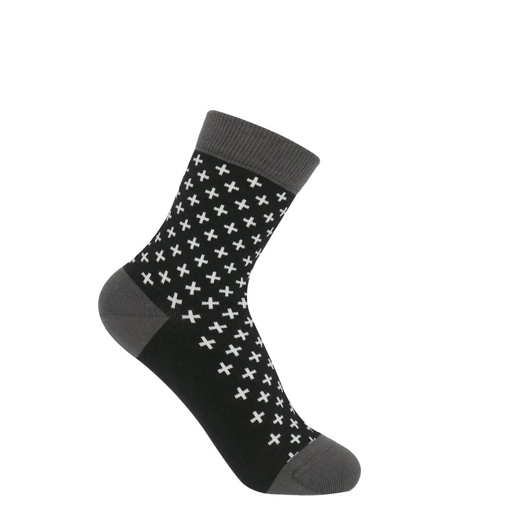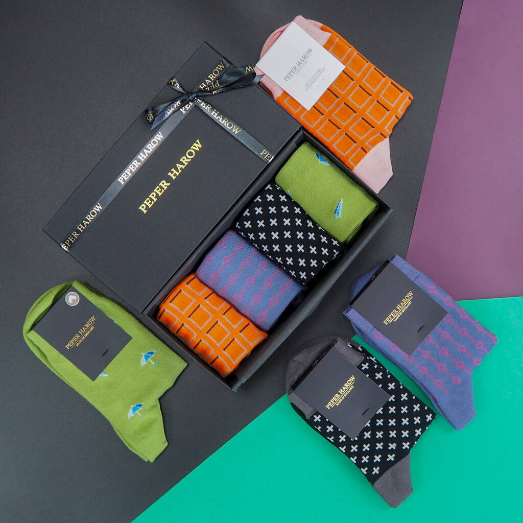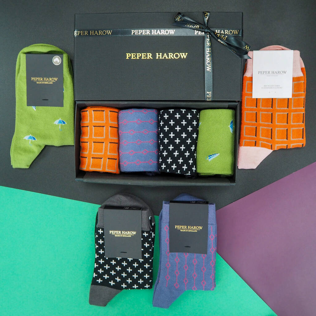 Witchy Women’s Gift Box — Cube, Beads, Crosslet & Umbrella designs in orange, purple, black & green. Luxe British-made socks for stylish enchantment.Discover the Witchy Women’s Gift Box: four elegant pairs in orange, purple, black and green, each bearing a standout motif — bold cube geometry, vertical bead pattern, contemporary crosslets, and playful umbrella icons. Crafted in England from premium yarns (recycled cotton, Supima cotton or organic cotton) with seamless toe and refined 168- or 200-needle gauge, these socks combine playful character with luxury comfort. Presented in a chic gift format, this bundle is perfect for the woman who loves design-rich accessories with British craftsmanship and a whimsical twist.